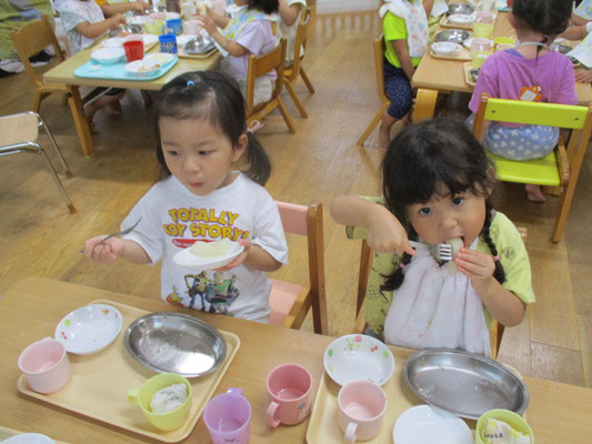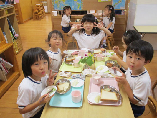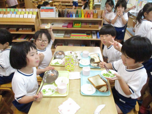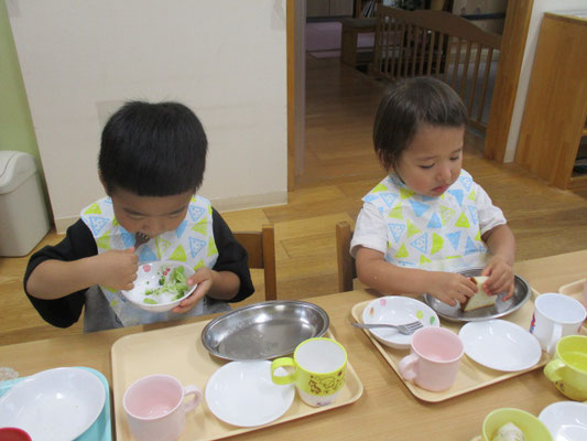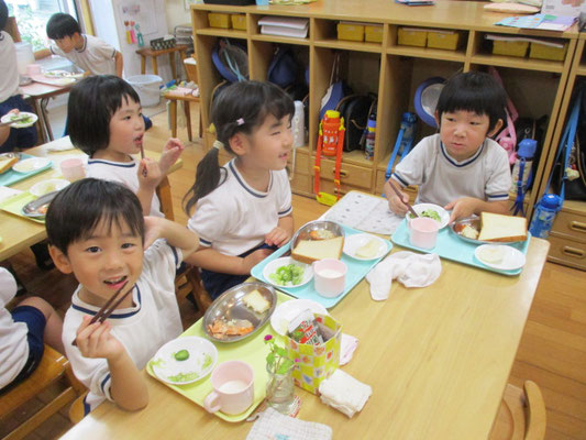今日は台風が近づいていることもあり、連日の暑さは少し和らぎました。子ども達は夏の疲れも見せずに毎日お鍋が空っぽになるくらい食欲旺盛です。2歳児クラスは保育士に「お皿を持って食べようね」と声を掛けられ、数名の子どもは意識して食べていました。幼児クラスは3,4,5歳児が同じテーブルにつき、異年齢の関わりを楽しみながら食事をしています。年長児は「口の中に入ってる時は喋らないで!」や、食材を落としてしまった時は「おこぼし」の紙で包むことも知らせています。た。異年齢が一緒にいることで、5歳児は自分の知っていることを伝え、3,4歳児はそれを真似したり、マナーを身に着けています。