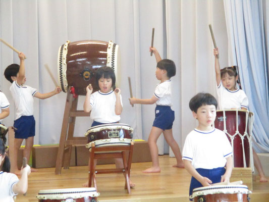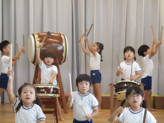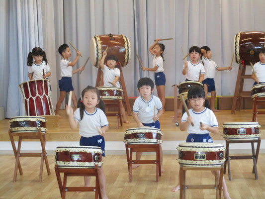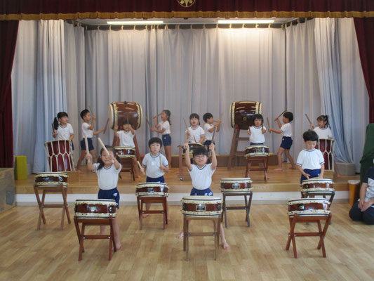 5歳児は毎週和太鼓練習を行っています。初めはバチ遊びや基礎打ちの練習から始まりました。5月から本格的に曲太鼓「エビカニクス」を練習しています。自分の背丈より大きい宮太鼓を担当し力強く叩いたり、平太鼓は人数が多いので、みんなで声を出してリズムを言いながら叩いていました。締太鼓は曲は一人で担当するので、少し不安な表情をしていますが、しっかりとリズムを覚えて叩けていました。それぞれ太鼓によってリズムが違うので他のリズムにつられてしまう様子も見られますが、曲に合わせて少しずつそろってくると、子ども達の意欲も増し自信につながっていきます。今は9月の桔梗の会(敬老会)での発表を目標に、みんな頑張って練習に励んでいます!