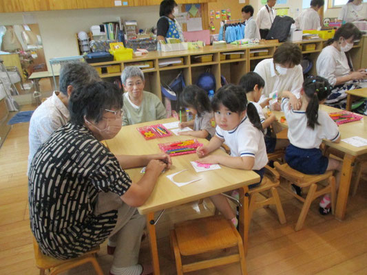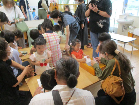 今日は保育園では、敬老の日をお祝いして桔梗の会が行われました。75名の祖父母が参加してくださり、子ども達と一緒にコマ回しや紙コップけん玉、トントン相撲作り、ぴょんぴょんカエル作り、釣りゲーム等、各コーナーでたくさん遊びました。子どもたちは頻繁に会う祖父母の方もいれば、久しぶりに会う祖父母の方もいて、何だかいつもと違う雰囲気で嬉しそうでした。1時間ほど一緒に遊んだ後は、ホールで各年齢ごとに出し物を披露しました。先日練習風景の写真を掲載しましたが、1歳児と2歳児は遊戯、3歳児は楽器を使ったリズム遊び、4歳児は歌と合奏、5歳児は和太鼓演奏と盛りだくさん。最後の和太鼓はアンコールにお応えして、もう一回元気に演奏を披露しました。先日園長先生が、「今年は戦後80年、みんなのおじいちゃんやおばあちゃんたちが頑張ってきたおかげで、今のみんなの幸せがある」という話を子ども達にしてくれました。今日、子どもたちが祖父母の皆様と穏やかな時間を過ごすことができたことに感謝し、またの再会を楽しみにしています。