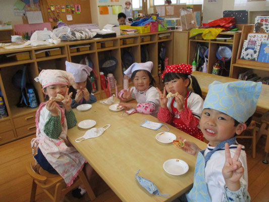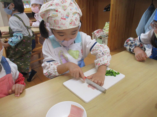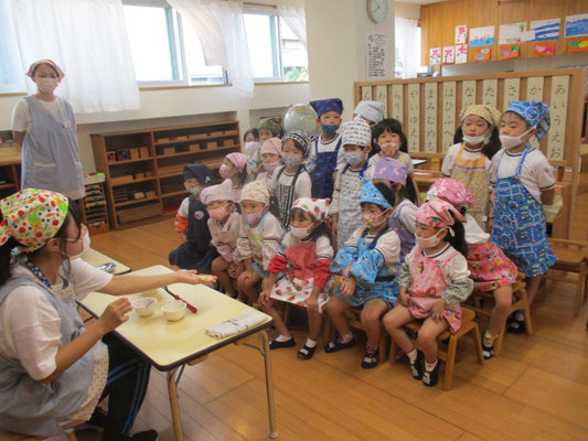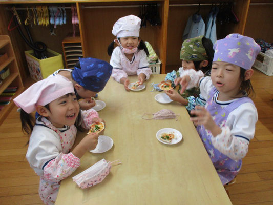 本日幼児クラスは、食育活動で「餃子ピザ」を作りました。初めに保育士が作り方のデモンストレーションをし、子ども達は出来上がるまでの手順をひと通り見て学びます。今回は包丁を使うので、使い方もきちんと説明します。その後、3,4,5歳児が同じグループになるように席を決めて調理開始です。5歳児がピーマンを細切りに切り、3,4歳児がベーコンを細切りに切ります。ピーマンは子どもたちが畑で育てたもので、今年は暑い日が続いていたために次々とピーマンが実り、今日の餃子ピザにも収穫したてのピーマンを使うことができました。餃子の皮にケチャップをぬり、炒めたピーマンとベーコン、チーズをのせてホットプレートで焼きます。材料はグループごとに準備してあるので、5歳児は「6人だから、ピーマンはこれくらいね!」と一人分の量を考えながら知らせていました。焼きたてを食べた子どもたちは、「カリカリしておいしい!」「ピーマンにがくない!」と美味しそうに食べていました。子どもに何かを提供する時は、まず大人がやり方をしっかり見せることが必要です。子どもは何でもすぐにやりたがりますが、始めから終わりまで順序立てて物事を進めていくためには、しっかり観察する力を育てていくことが大切です。私たち大人は「やってみるから見ててね」と、子どもが追視できる速さを考えながらゆっくりとやり方を見せ、「〇〇ちゃん、どうぞ」と子どもにつなげていくことが大切です。