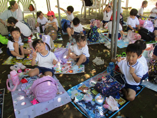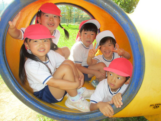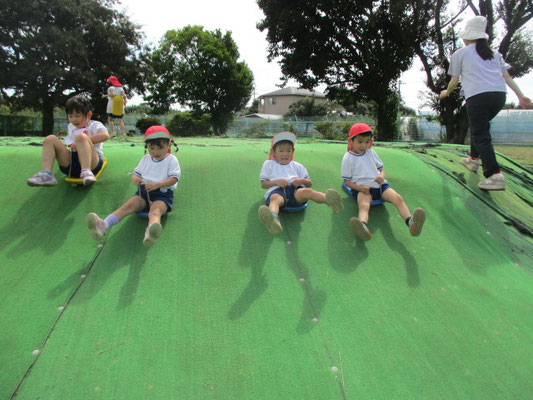 9月25日、幼児クラスは秋のバス遠足で市川市動植物園に行ってきました。大型バスに子ども達は大喜びで、行きは景色を見たり、隣の友だちとしりとりをしながら出発しました。動植物園に到着して、まず豆汽車に乗りました。半分に分かれて乗車したので、遠くに見える友だちに「ヤッホー!」「お~い!」と呼び掛けて嬉しそうに手を振っていました。ちょうど芝生ではアルパカが散歩をしていたり、動物見学をしていると、飼育員さんが大きなリクガメを柵から出して歩かせてくれました。子ども達はアルパカやリクガメの後をついて歩き、アルパカが勢いよく歩いたり首を動かすと「キャ~!!」と大興奮でした。その後は遊具や芝生の山でそり滑りをしてたくさん遊んだり、スタンプラリーや小動物を見学しました。3歳児は初めての遠足だったので、どの場面でも「えんそくってたのしいね!」と嬉しそうでした。夏の間、子ども達は殆ど戸外に出られなかったので、久しぶりに秋晴れの下、たくさん身体を動かして活動することができて、いきいきとした表情をたくさん見ることができて嬉しかったです。
