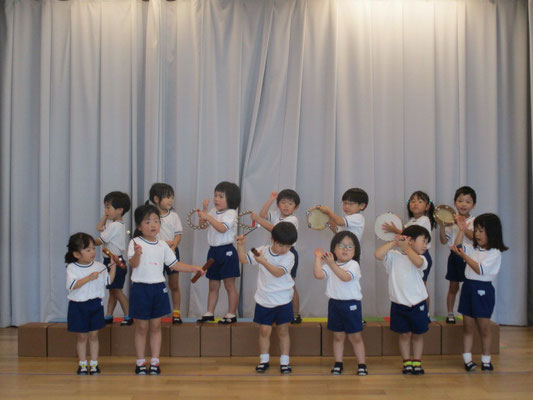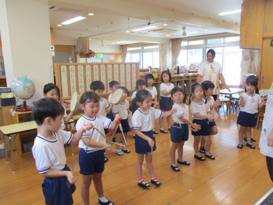 今日から2学期が開始しました。まだまだ残暑が厳しいですが、子ども達は毎日元気に活動しています。 夏休みを終えた子どもも登園し、本格的に桔梗の会(敬老会)の練習が始まりました。3歳児は「森のくまさん」の歌に合わせてリズム遊びを練習しています。4歳児は「虫の声」の曲で合奏を練習しています。3歳児は楽器は違っても同じリズムの繰り返しなので、リズムを覚えて楽しんで行っています。4歳児は楽器ごとにリズムが分かれていますが、他のリズムを聞きながらみんなで合わせる楽しさを体験しています。5歳児は進級してから練習を開始した和太鼓で「エビカニクス」を練習中。4つの太鼓によってリズムが違うので、声を出し合いながら演奏していました。桔梗の会まで2週間、どの年齢も祖父母に見てもらえるのを楽しみに張り切って練習しています。