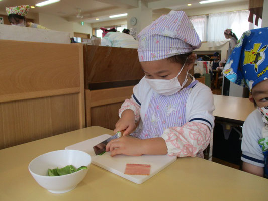 5月の食育活動で1,2歳児はたけのこの皮をむいたり、給食で食べるキャベツはがしを行いました。1歳児は保育士と一緒に1枚1枚キャベツをはがし、それを小さくちぎりました。まだ丸ごとのキャベツを目の前にすると怖くて手が出ない子どももいましたが、ビリビリ~とちぎっって楽しそうでした。また、たけのこに触れて皮をめくったり手に持って満足していました。