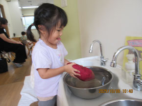 2歳児クラスでは10月の食育活動で、「さつま芋団子」用に、さつまいも洗いをしました。大きなさつまいもに子ども達も大喜び。ボウルに水を入れてゴシゴシ洗います。子ども達が洗ってくれたさつまいもは、この日のおやつで美味しくいただきました。ちょうどこの日は中秋の名月。さつま芋団子はウサギの模様がついていて、子ども達も嬉しそうでした。