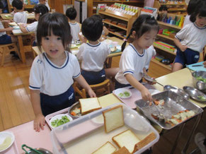 5月から幼児クラスの食育活動が始まりました。年度の始めなので、火は使わず簡単に作れるジャムサンドです。6人グループでジャムを分けながらパンに塗っていきます。5歳児はジャムの量に目を光らせ、「もうちょっと!」「それくらい}等、3歳児に声をかけながら行っていて面白かったです。すぐに給食の時間になったので、みんな嬉しそうに食べていました。
