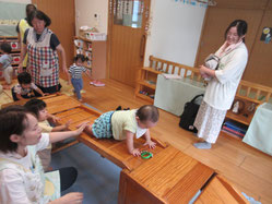 今回の保育所体験は1歳児と一緒に体育遊びです。初めは1歳児からスタートです。何度も行っているので、高さのある梯子も歩いて渡っていきます。参加してくださったお子さんは、まだハイハイのお子さんでしたが、高さのある梯子も泣かずに、上手に進んでいくのでびっくり!!お母さんもお子さんの遊ぶ姿を嬉しそうに見ていました。