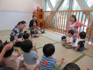 保育園に小さな赤ちゃんたちが遊びに来てくれました。1歳児クラスで在園児と一緒に絵本を見たり、手遊びをしました。この日は鈴を使って楽器遊びです。「もりのくまさん」の歌に合わせて、みんなで鈴を鳴らして遊びました。1歳児は何回か行っているので、自信満々に鈴を鳴らし、保育所体験に参加してくださったお子さんも、お母さんと一緒に楽器遊びを楽しみました。保育園では一番小さい1歳児でずが、自分たちよりも小さな赤ちゃんと一緒に、よい交流になりました。