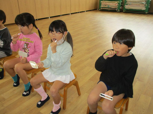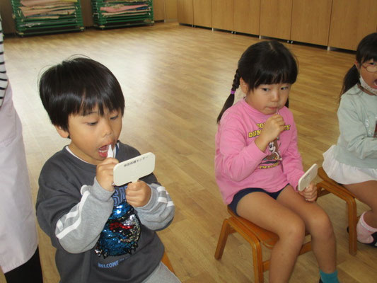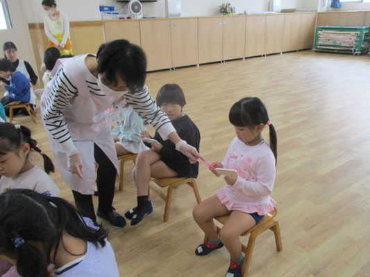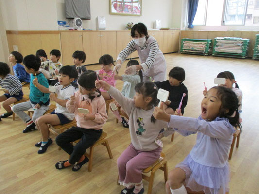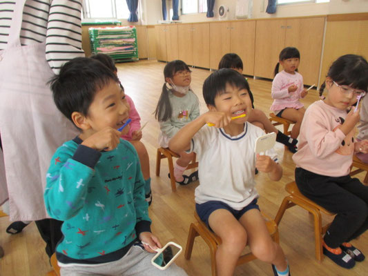 6歳臼歯が生えている子どもは数名ですが、健康な歯でいるためには毎日の歯ブラシ大切であることを話して下さいました。園では3,4,5歳児が毎日給食後、おやつ後に歯磨き(ブラッシングのみ)をしています。いつも何気なく使っている歯ブラシですが、この日は自分の歯ブラシを使って正しい姿勢になり、どのように歯ブラシを持てばよいのかを丁寧に指導していただきました。「歯ブラシのおなかをお父さん指でしっかり持って下さい」と言われると、歯科衛生士さんの見本を真似して持つ子ども達。「歯ブラシを奥歯にあてたら口を閉じて磨きます。」と言われると、しっかり口を閉じて磨く子どももいれば、普段の習慣通りに口を開けたまま磨く子どもも…。 歯磨き時の飛沫を防ぐためにも、口を閉じて磨く習慣を身に着けていきたいと感じました。家庭でも幼児になると子どもが自分で磨く習慣がついていると思いますが、まだまだ磨き残しがある年齢です。仕上げ磨きはしっかり大人が行い、子どもの健康な歯を保っていきましょう!