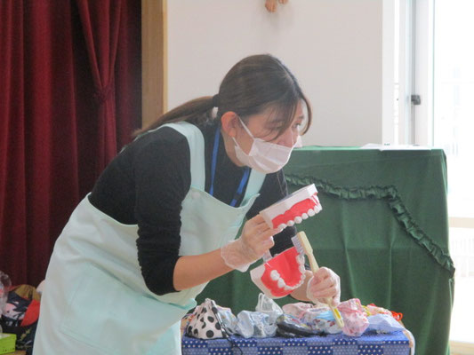 10月31日に保健所の歯科衛生士の方が来訪し、5歳児は「ハロー6ちゃん!」に参加しました。
